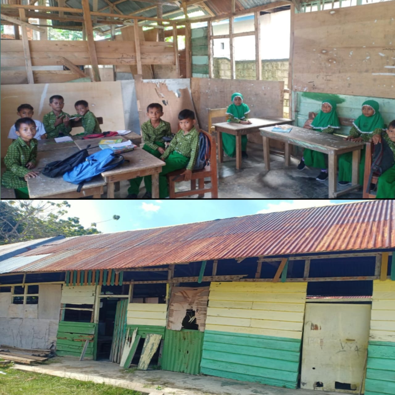 Kondisi ruang kelas dan bangunan Sekolah Yayasan Pendidikan Islam (YPI) Madrasah Ibtidaiyah (MI) Al-Amin yang terletak di Desa Tolandona Matanaeo, Kecamatan Sangia Wambulu, Kabupaten Buton Tengah (Buteng), Sulawesi Tenggara.