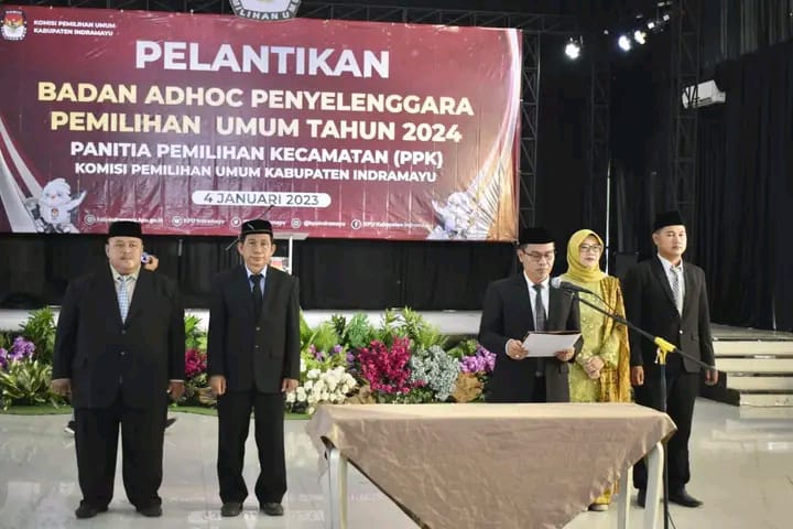 Mandalapos.co.id, Indramayu — Bupati Indramayu Nina Agustina Da’i Bachtir melalui Asisten Daerah Pemerintahan dan Kesejahteraan Rakyat Setda Indramayu Jajang Sudrajat, menghadiri pelantikan Badan Adhoc Penyelenggara Pemilihan Umum Tahun 2024 dan Panitia Pemilihan Kecamatan (PPK) pada Komisi Pemilihan Umum (KPU) Kabupaten Indramayu, di Gedung PGRI Indramayu, Rabu (4/1/2023).