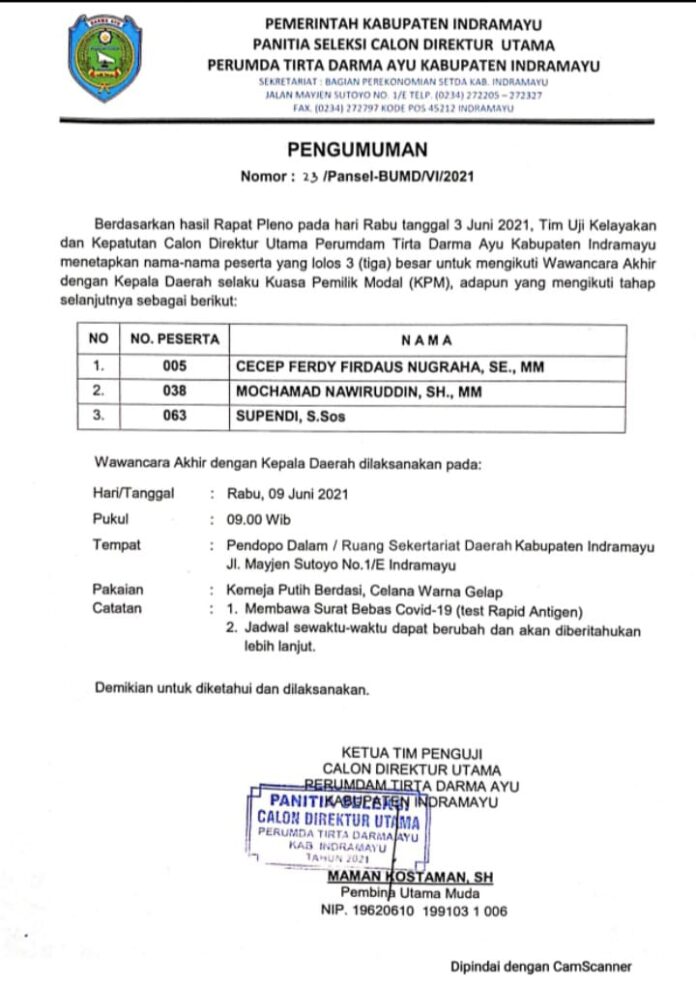 Berdasarkan surat pengumuman dengan nomor : 23/Pansel BUMD )VI/2021, yang dilihat mandalapos, didapati 3 nama tersebut yakni, Cecep Ferdy Firdaus Nugraha MM,  Mochamad Nawirudin MM, Supendi .S Sos.