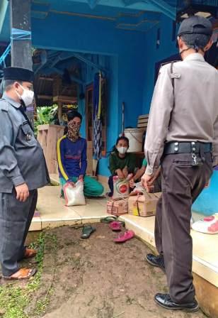 – Bripka Rijal mendistribusikan 20 kantong beras di Desa Cimanggu