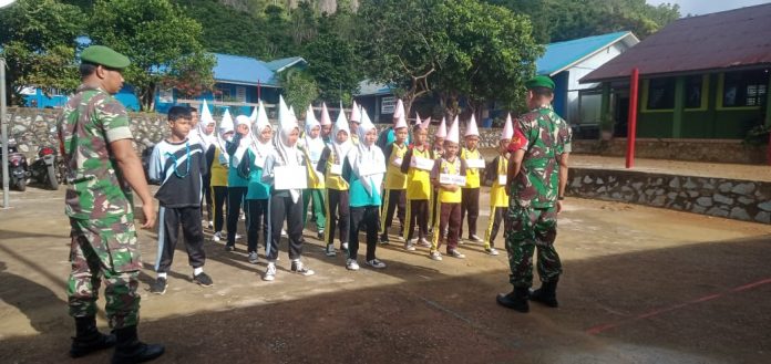 Mandalapos.co.id, Anambas — Anggota Koramil 02 Tarempa, Sertu Syaiful dan Serda Bambang Syahputra, memberikan pengenalan materi peraturan baris berbaris (PBB) di SMP 5 Bukit Tambun, Desa Tarempa Selatan, Kabupaten Kepulauan Anambas, Rabu (12/7/2023).