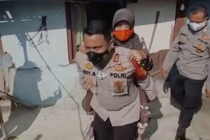 AKP Edy terlihat menggendong Nenek Emah dari kediamannya menuju mobil polisi. Setibanya di lokasi vaksinasi, hal serupa juga dilakukan untuk mengantarkan Nenek Emah dari mobil ke gerai vaksinasi.