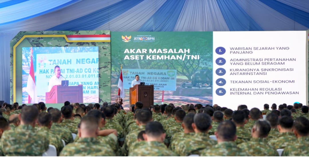 Selain persoalan aset belum bersertipikat, Wamen Ossy menjelaskan tiga masalah lain yang umum terjadi. Pertama, sengketa atau klaim ganda, yang sering muncul karena batas wilayah tidak jelas atau dokumen lama hilang. Kedua, alih fungsi dan pemanfaatan yang tidak sesuai, yakni aset TNI yang berubah menjadi fasilitas komersial atau lahan garapan melalui kerja sama tertentu. “Nah, perubahan ini tentunya dapat menimbulkan permasalahan hukum di kemudian hari,” tegasnya.