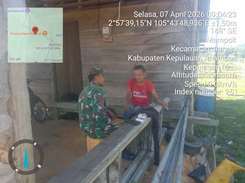 Anambas, Mandalapos.co.id — Babinsa Koramil 04/Letung, Kodim 0318/Natuna, Koptu Fian Hendratmo, melaksanakan kegiatan komunikasi sosial (komsos) bersama warga di Desa Bukit Padi, Kecamatan Jemaja Timur, Kabupaten Kepulauan Anambas, Selasa (7/4/2026).