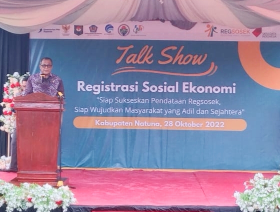 Membacakan pidato Bupati Natuna, Asisten III Bidang Administrasi Pemerintahan Kabupaten (Pemkab) Natuna, Tasrif, mengapresiasi terselenggaranya kegiatan Talk Show Registrasi Sosial Ekonomi (Regsosek).