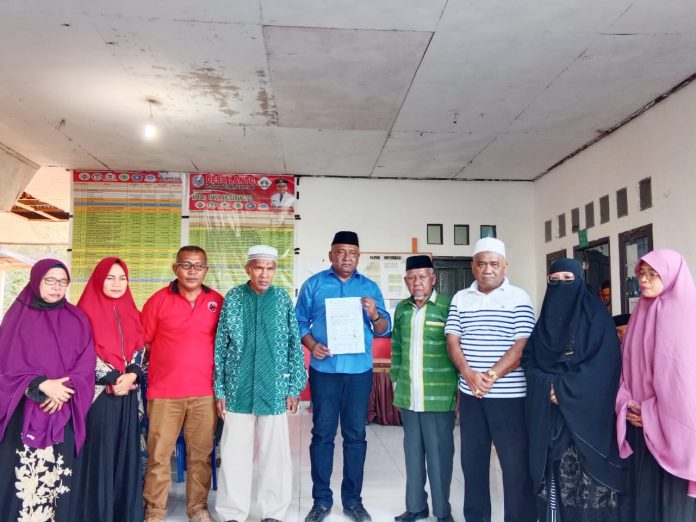 Ketua DPC PDIP Buton Tengah, Samahuddin (tengah) dan pelapor Taslim (baju merah) bersama pihak keluarga pelaku memperlihatkan hasil kesepakatan mediasi.