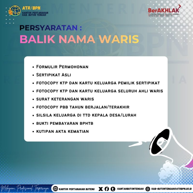 Berikut adalah daftar lengkap dokumen yang wajib disiapkan ahli waris saat mengajukan permohonan Balik Nama Waris di Kantor Pertanahan Kabupaten Buton Tengah, berdasarkan pengumuman melalui poster :