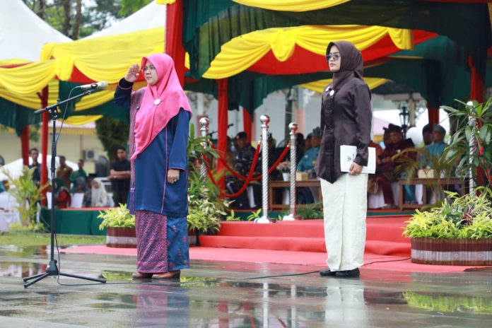 SIAK, mandalapos.co.id – Hujan deras mengguyur Kota Siak sejak pagi, namun semangat upacara peringatan Hari Jadi Kabupaten Siak ke-26 tetap terasa khidmat di Lapangan Tugu Depan Istana Siak.