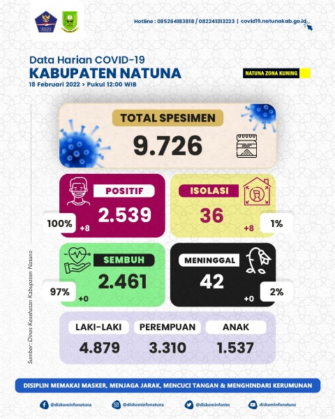 Berdasarkan data Covid-19 milik Pemkab Natuna, total kasus positif Covid-19 hingga saat ini sebanyak 2.539 orang, sembuh 2.461 orang, meninggal 42 orang dan yang masih menjalani isolasi 36 orang. ***Alfian