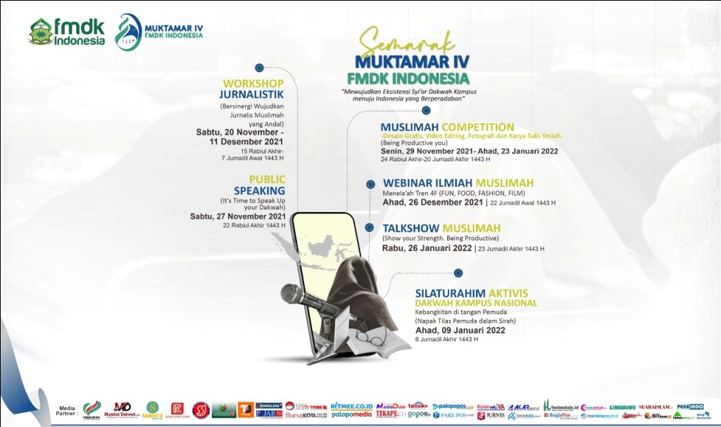 MAKASSAR – Forum Muslimah Dakwah Kampus Indonesia (FMDKI) Pusat akan menggelar Muktamar IV dengan rangkaian Semarak Muktamar dari November 2021-Februari 2022.