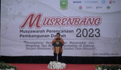 Musrenbang Kabupaten Natuna tahun 2023 mengusung tema “Peningkatan kesejahteraan masyarakat dan penguatan tata kelola pemerintahan di dukung dengan akselerasi kualitas sumberdaya manusia”. Acara di gelar di Gedung Sri Serindit, Jalan Yos Sudarso, Kelurahan Batu Hitam, Kecamatan Bunguran Timur, pada Kamis (16/03/2023) siang.