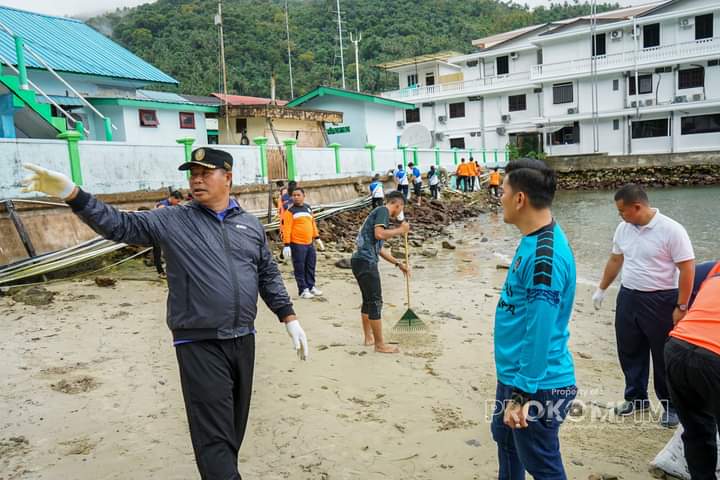 Selain coffee morning dan senam bersama, Bupati bersama Forkopimda Kepulauan Anambas juga melakukan aksi membersihkan sampah di pantai sekitar Lanal Tarempa.