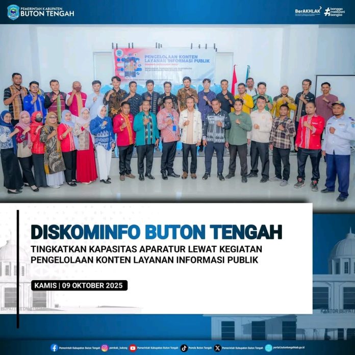 Buton Tengah, Mandalapos.co.id – Pemerintah Kabupaten Buton Tengah (Buteng) melalui Dinas Komunikasi, Informatika, Statistik, dan Persandian (Diskominfo) menggelar sosialisasi kegiatan pengelolaan konten layanan informasi publik dengan mengundang seluruh pejabat dan staf yang membidangi kehumasan Organisasi Perangkat Daerah (OPD) lingkup Pemerintah Kabupaten Buton, berlangsung di Aula Pancana Lantai V Kantor Bupati Buton Tengah, Kamis (9/10/2025).