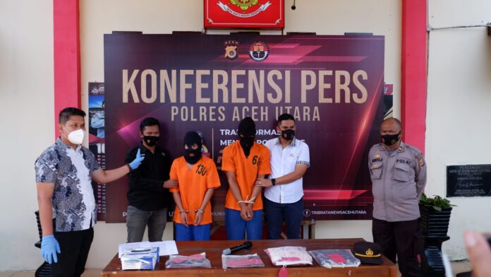 Aceh Utara – Personil Sat Reskrim Polres Aceh Utara menangkap dua pelaku yakni Sy (32) pemerkosaan terhadap anak di bawah umur dan Fl (27) Tindak pidana pemerasan disertai ancaman yang didahului dengan persetubuhan, 2 pelaku tersebut ditangkap dalam pengungkapan dua kasus laporan dan lokasi yang berbeda saat dikonfirmasi melalui konferensi pers di depan Gedung Reskrim Polres setempat, Kamis (28/10/2021).