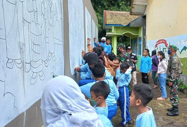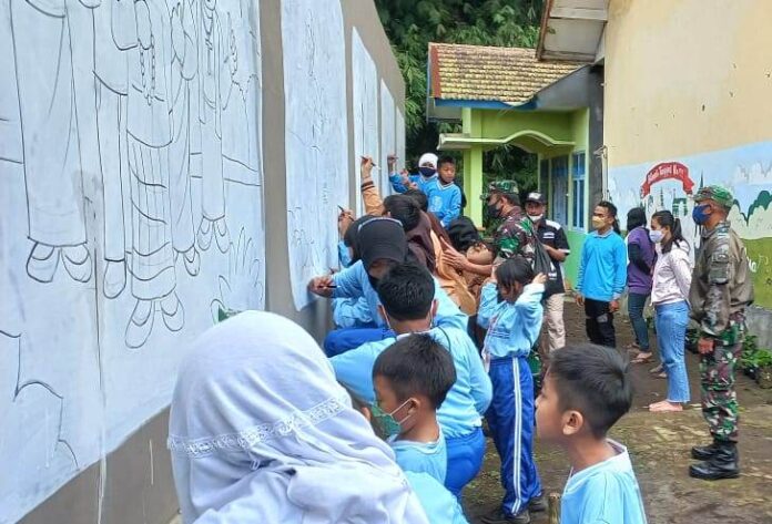 Mandalapos.co.id, Probolinggo — Koramil 0820/08 Sukapura bersinergi dengan SDN Sapikerep 2 Kabupaten Probolinggo, menggelar kegiatan lomba melukis mural Pancasila di tembok pagar pembatas sekolah, Kamis (17/3).