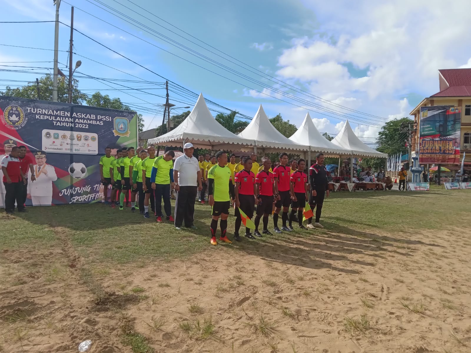 Usai melakoni laga eksibisi dengan para pejabat daerah, Bupati dan Wakil Bupati Kepulauan Anambas masing-masing melakukan tendangan pertama tanda dibukanya Turnamen Sepakbola Askab PSSI Kepulauan Anambas.