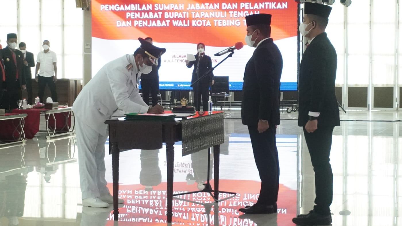 Mandalapos.co.id, Tebing Tinggi — Gubernur Sumatera Utara Edy Rahmayadi mengambil sumpah jabatan dan melantik Sekretaris Daerah (Sekda) Kota Tebing Tinggi Muhammad Dimiyathi, menjadi Penjabat (Pj.) Wali Kota Tebing Tinggi dan Sekda Kabupaten Tapanuli Tengah (Tapteng) Yetti br Sembiring, menjadi Pj. Bupati Tapteng, Selasa (24/5) di Aula Tengku Rizal Nurdin, Rumah Dinas Gubernur, Medan.