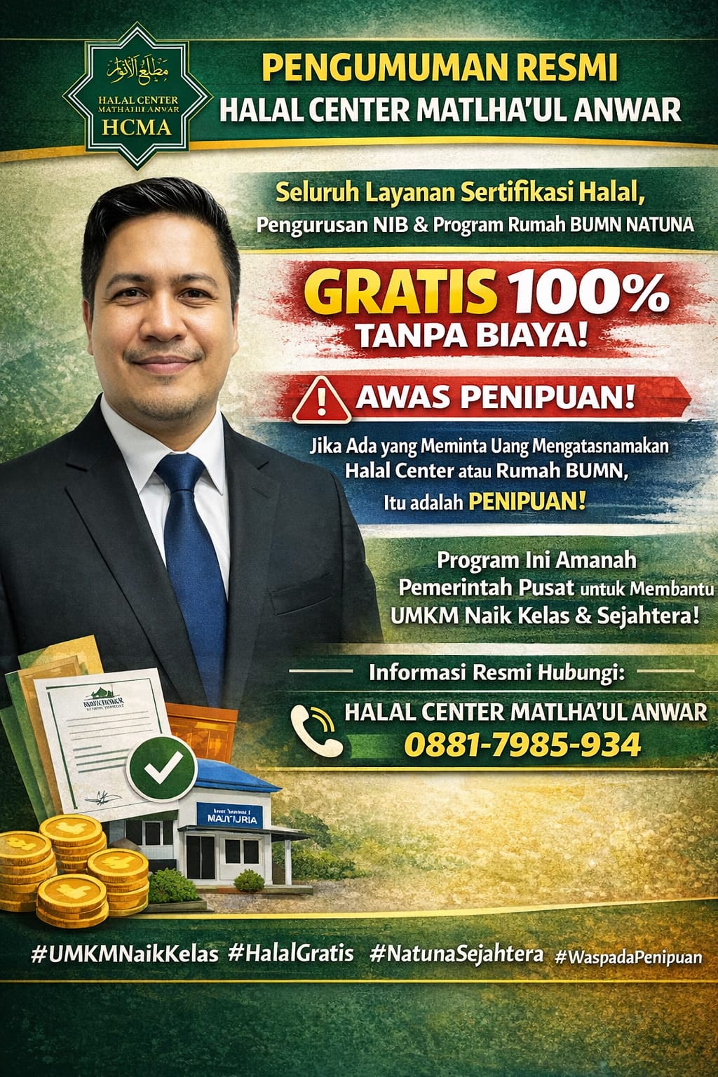 Halal Center Matlha’ul Anwar berkomitmen untuk terus memberikan pendampingan secara transparan, profesional, dan tanpa pungutan biaya, demi mendukung pertumbuhan UMKM yang mandiri, berdaya saing, dan berkelanjutan di Kabupaten Natuna. Masyarakat diimbau untuk selalu memastikan informasi resmi sebelum mempercayai pihak yang mengatasnamakan lembaga tersebut, demi menghindari potensi penipuan.*
