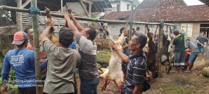 Pemotongan 8 hewan kurban kambing itu dilakukan bersama antara panitia kurban, pemuda dan warga setempat.