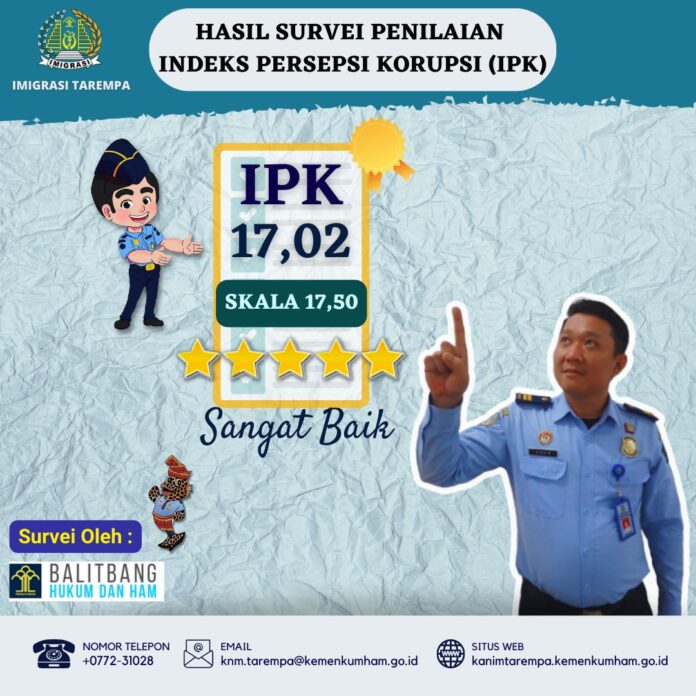 Hasilnya, Indeks Persepsi Korupsi (IPK) pada Kantor Imigrasi Tarempa dari skala sebesar 17,50 mendapatkan 17,02 yang artinya sangat baik. Begitu pun dengan Indeks Kepuasan Masyarakat (IKM) yang juga sangat baik dengan indeks 16,97.