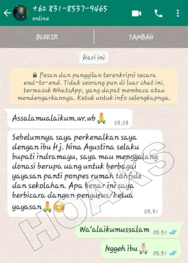Dalam postingannya di akun instagram pribadinya Bupati Nina Agustina menyampaikan, bahwa seseorang yang mengatasnamakan dirinya dengan nomor Whatsapp 0831-8537-9465 adalah palsu.