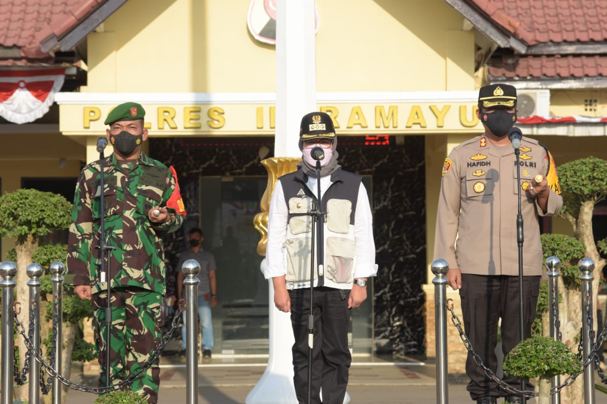 Apel kesiapan PPKM Darurat dipimpin langsung Bupati Indramayu Nina Agustina didampingi Kapolres AKBP Hafidh S Herlambang dan Dandim 0616 Indramayu Letkol Inf Teguh Wibowo.