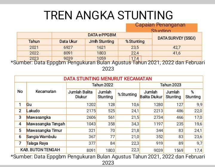 Sebagai informasi, Dinas Kesehatan Buton Tengah merilis data stanting di 7 Kecamatan pada Februari 2023 dengan jumlah keseluruhan angkat stunting di Kabupaten Buton Tengah mencapai 1569 stunting balita/anak atau 17,4 %.