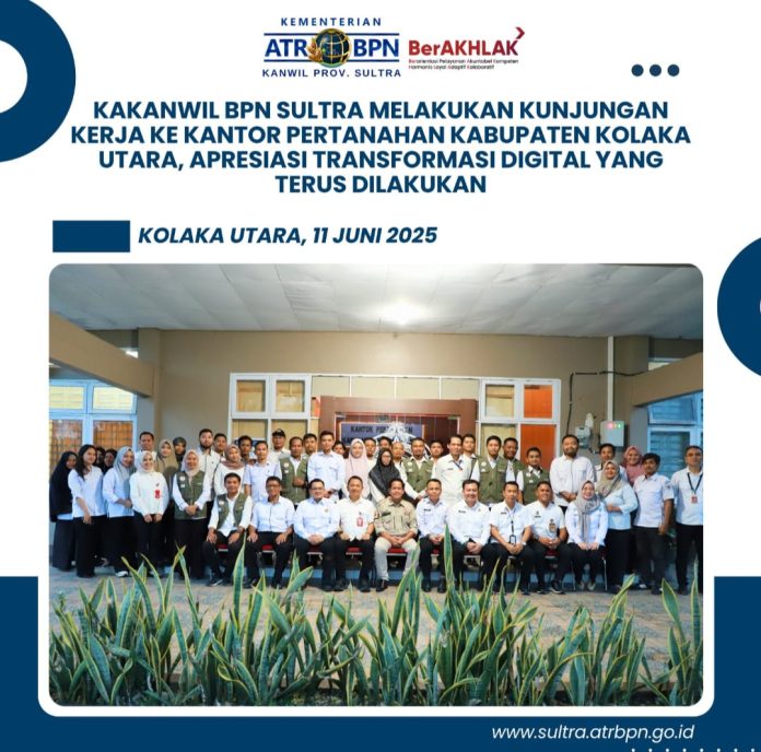 Mandalapos.co.id, Kolaka Utara – Kepala Kantor Wilayah BPN Provinsi Sulawesi Tenggara (Kakanwil BPN Sultra), Ir. Rahmat, A.Ptnh., M.M., QRMO., CODP., melakukan kunjungan kerja (kunker) ke Kantor Pertanahan Kabupaten Kolaka Utara (Kolut), 11 Juni 2025. Kegiatan ini turut dihadiri Kabid Survei dan Pemetaan, Kabid Pengadaan Tanah dan Pengembangan, Kepala Kantor Pertanahan Kab. Kolaka dan Bombana, serta tim dari Kanwil BPN Sulawesi Tenggara.