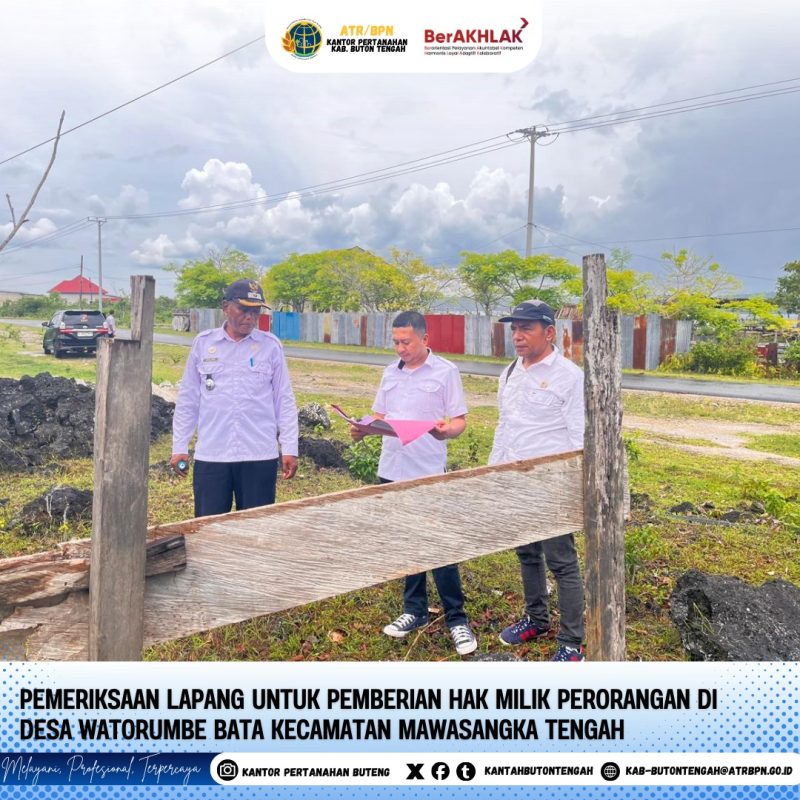 Buton Tengah, Mandalapos.co.id – Kantor Pertanahan Kabupaten Buton Tengah (Kantah Buteng) kembali melaksanakan kegiatan pemeriksaan lapangan guna memproses permohonan pemberian Hak Milik Perorangan di wilayahnya. Kegiatan ini berlangsung pada hari Rabu, 27 November 2025, bertempat di Desa Watorumbe Bata, Kecamatan Mawasangka Tengah.