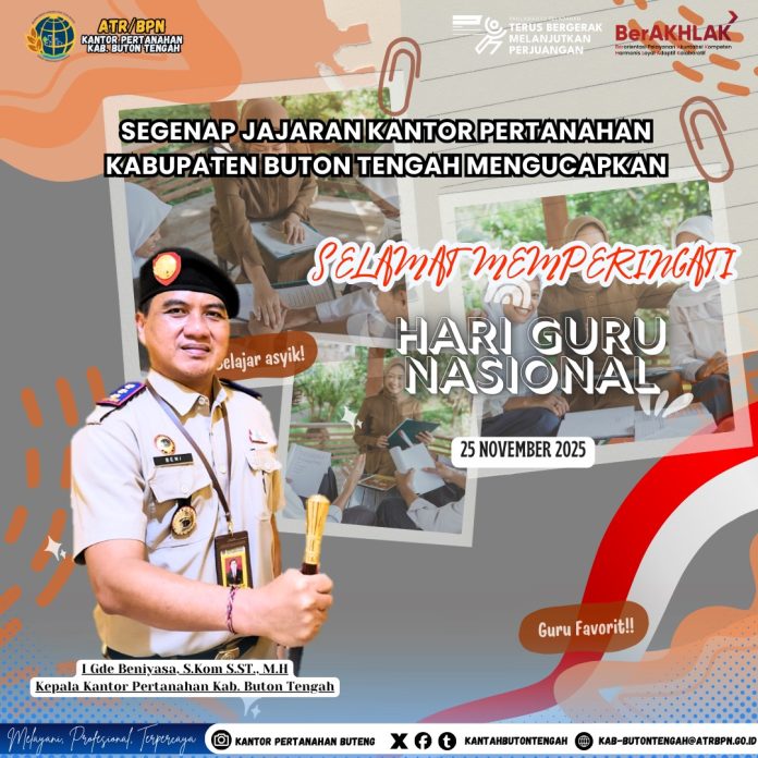 Buton Tengah, Mandalapos.co.id – Seluruh jajaran Kantor Pertanahan Kabupaten Buton Tengah (Kantah Buteng) menyampaikan ucapan selamat dan apresiasi setinggi-tingginya kepada para pendidik se-Indonesia dalam rangka memperingati Hari Guru Nasional (HGN) Tahun 2025 yang jatuh pada 25 November.