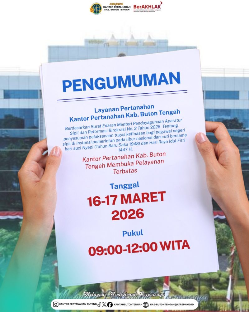 ​Buton Tengah, Mandalapos.co.id – Dalam rangka memberikan kemudahan dan kepastian bagi masyarakat yang ingin mengurus perihal pertanahan, Kantor Pertanahan (Kantah) Kabupaten Buton Tengah menerbitkan pengumuman resmi mengenai penyesuaian jadwal operasional.