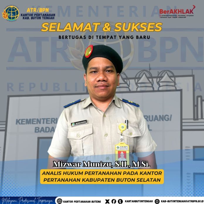 Mizwar Munizu kini dipercaya menjalankan amanah baru sebagai Analis Hukum Pertanahan pada Kantor Pertanahan Kabupaten Buton Selatan.