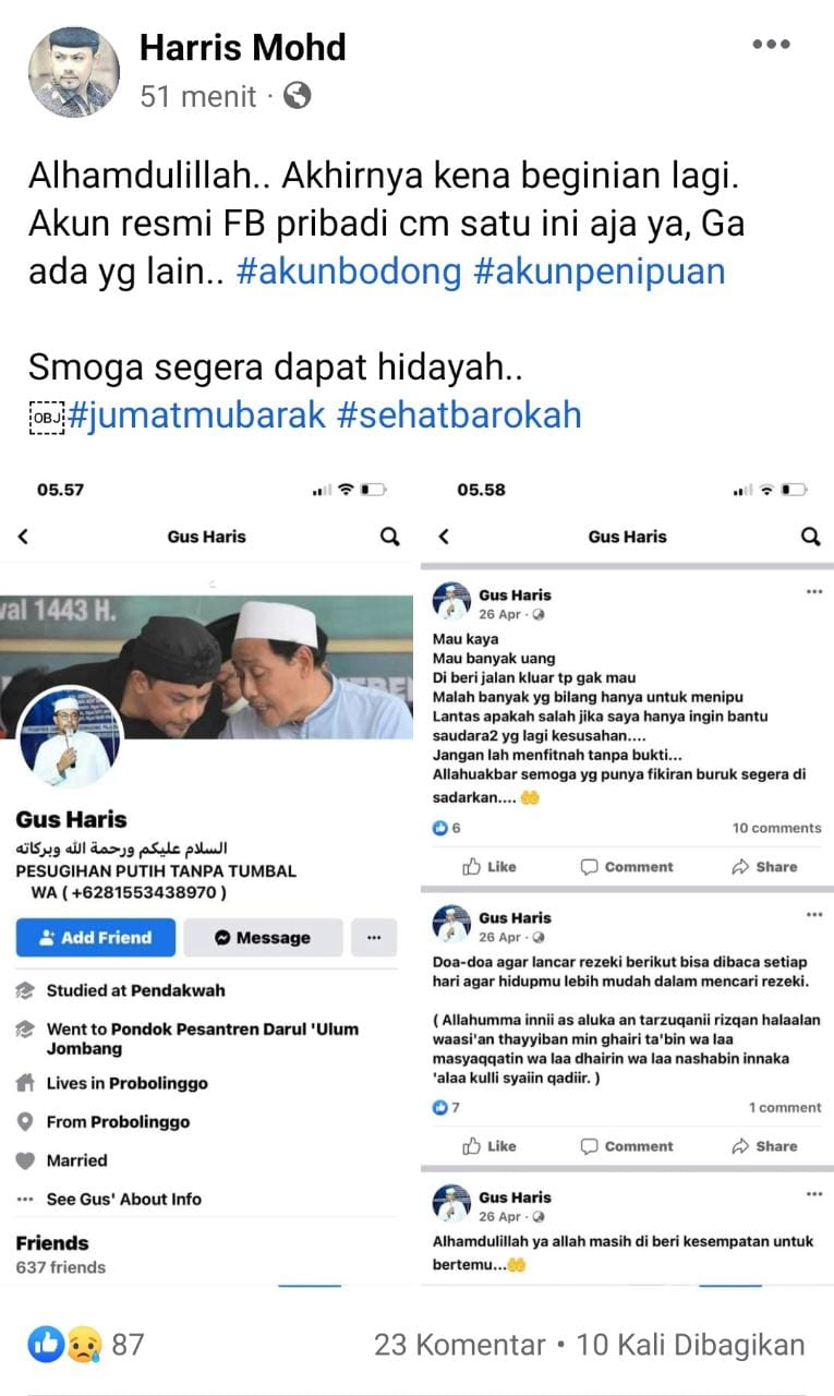 Akun Facebook atas nama Gus Haris tersebut, merupakan akun Facebook palsu yang dibuat oleh orang tidak bertanggung jawab.