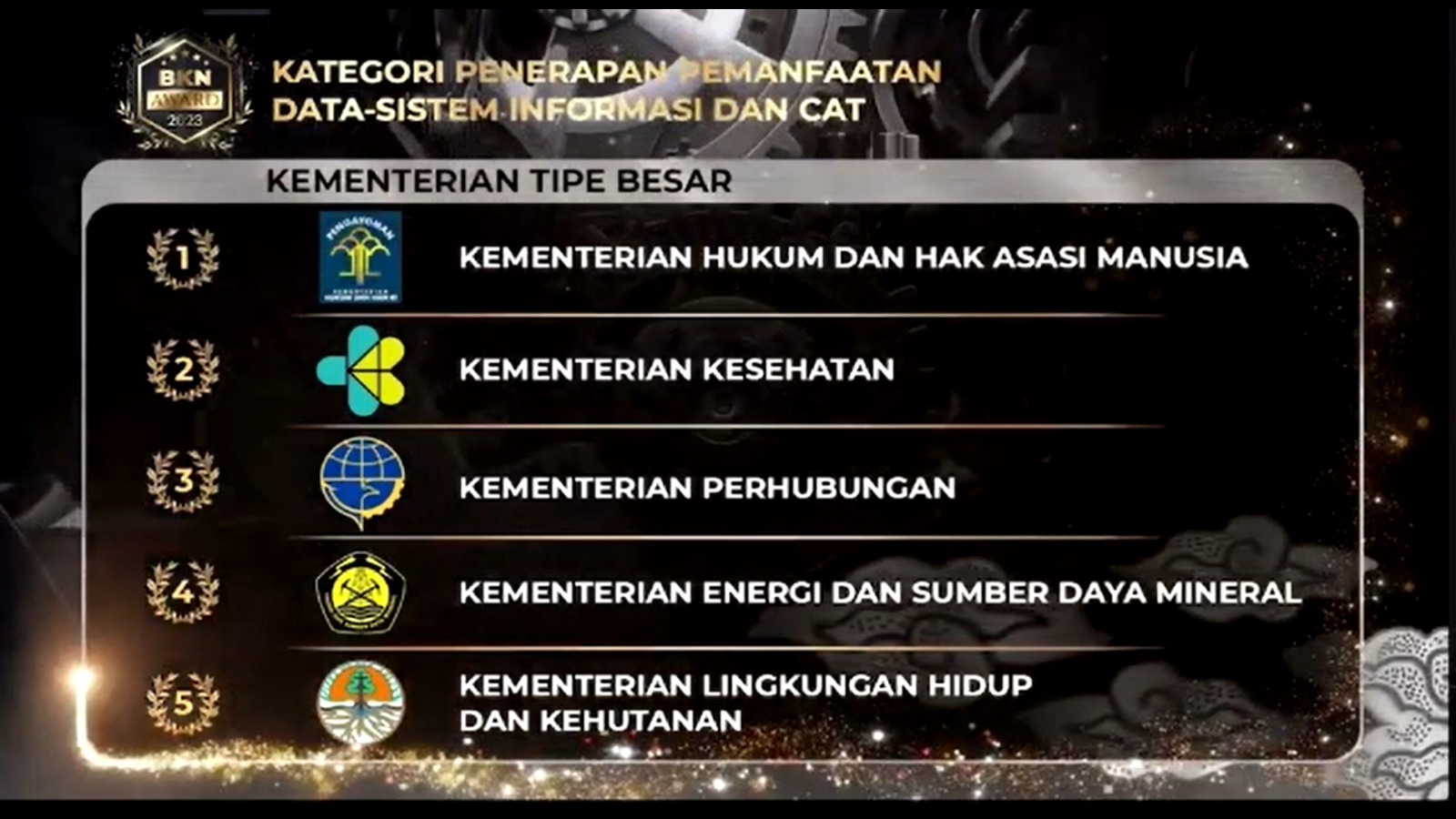 Sekretariat Jenderal(Kemenkumham) sukses menyabet tiga penghargaan sekaligus dalam Badan Kepegawaian Negara (BKN) Award Tahun 2023. Penghargaan tersebut diraih dalam tiga kategori penilaian untuk kementerian tipe besar. Salah satunya bahkan meraih terbaik pertama dalam pemanfaatan sistem Computer Assisted Test (CAT).
