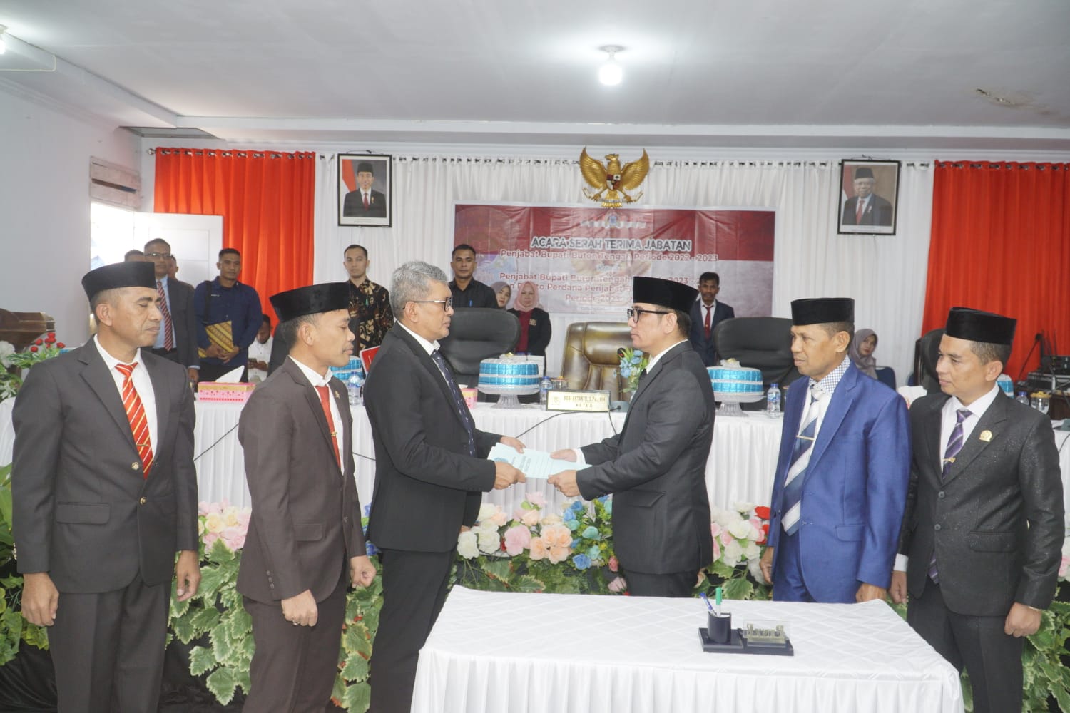 Acara sera terima jabatan Pj Bupati Buton Tengah Periode 2022-2023, Muhammad Yusup, kepada Pj Bupati Buton Tengah periode 2023-2024, Andi Muhammad Yusuf, di saksikan langsung unsur pimpinan DPRD.