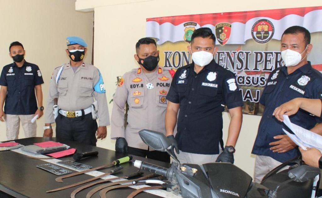 Polisi yang mendapat laporan, kemudian mengamankan seorang pelaku berinisial ABS (18) bersama barang bukti enam buah celurit. Sementara pelaku lainnya masih dalam pengejaran.