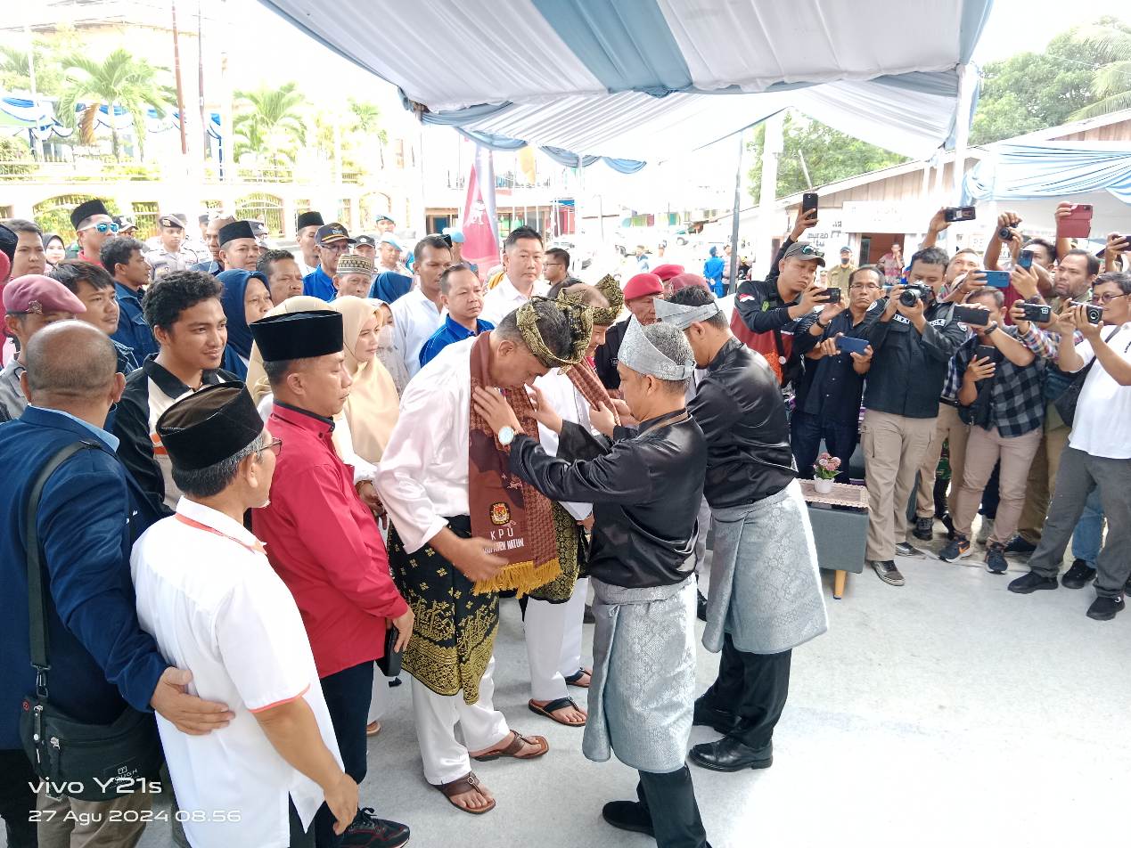 Setibanya di KPU Natuna, kedatangan paslon berslogan WS-RH ini disambut dengan tarian persembahan, sebuah tradisi budaya khas Natuna. Ketua dan Komisioner KPU Natuna kemudian mengalungkan syal atau selendang sebagai tanda penghormatan.