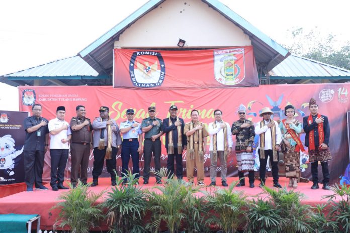 Sebanyak 18 Bendera Kontestan Pemilu dibawa langsung oleh Ketua KPU Provinsi Lampung, Erwan Bustami dan diserahkan kepada Ketua KPU Tulang Bawang, Reka Punnata. Acara spektakuler ini juga diisi dengan beragam acara mulai dari, sendra tari, marching band, dan seni bela diri pencak silat.