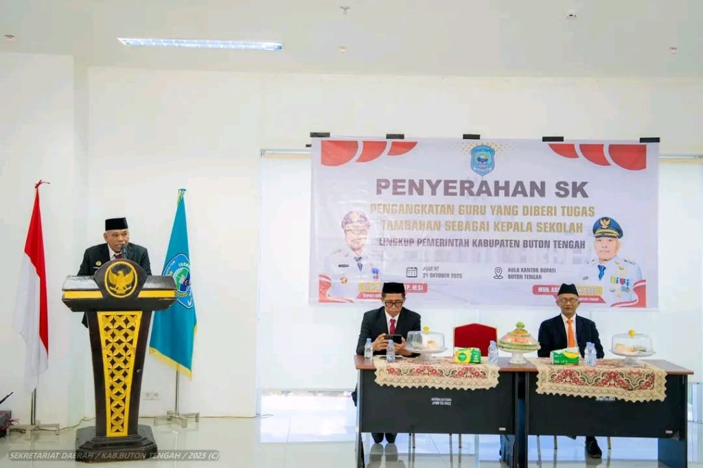 Buton Tengah, Mandalapos.co.id – Wakil Bupati Buton Tengah, Muh. Adam Basan, S.Sos., memimpin pelaksanaan pelantikan dan penyerahan Surat Keputusan (SK) pengangkatan guru menjalankan tugas tambahan sebagai kepala sekolah (Kepsek) tingkat sekolah Taman Kanak-kanak (TK) dan Sekolah Dasar (SD), dan Sekolah Menengah Pertama (SMP) di lingkungan Pemerintah Kabupaten Buton Tengah, bertempat di Aula Lantai 5 Kantor Bupati, Jumat (31/10/2025) sore.