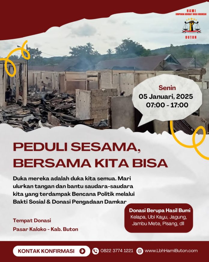 Buton, Mandalapos.co.id – Lembaga Bantuan Hukum Himpunan Advokat Muda Indonesia Cabang Buton (LBH HAMI Buton) menginisiasi gerakan sosial bertajuk “Peduli Sesama, Bersama Kita Bisa”, sebagai bentuk respons cepat terhadap peristiwa kebakaran hebat yang menghanguskan ratusan kios Pasar Kaloko di Kecamatan Pasarwajo, Kabupaten Buton, yang terjadi pada Senin (29/12/2025) malam sekitar pukul 23.00 Wita.