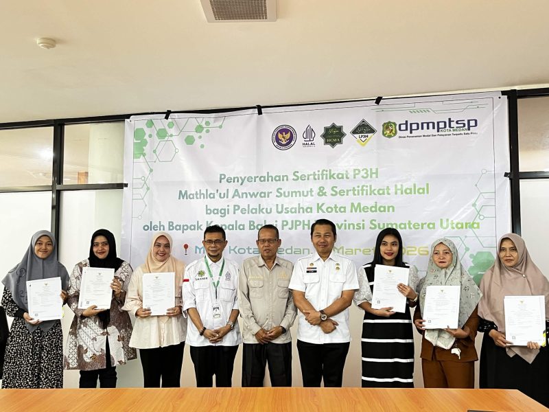 Medan, mandalapos.co.id — Halal Center Mathla’ul Anwar (HCMA) Sumatera Utara kembali menunjukkan komitmennya dalam memperkuat ekosistem halal melalui kegiatan penyerahan sertifikat Pendamping Proses Produk Halal (P3H) serta sertifikat halal bagi para pelaku usaha di Kota Medan.