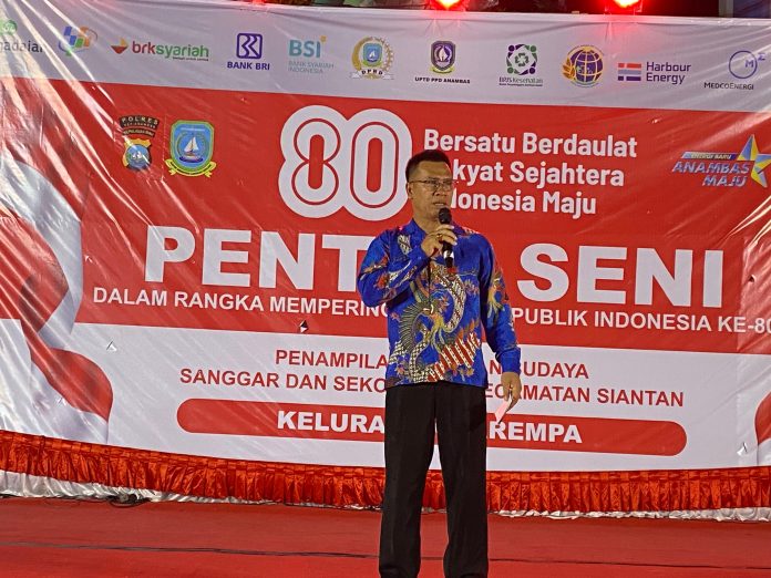 Anambas, mandalapos.co.id — Bupati Kepulauan Anambas, Aneng, secara resmi membuka Malam Seni Budaya dan Sanggar tingkat sekolah se-Kecamatan Siantan dalam rangka menyambut HUT ke-80 Republik Indonesia tahun 2025. Kegiatan tersebut digelar di halaman Kantor Bupati lama, Taman Bermadah, Kelurahan Tarempa, Kecamatan Siantan, Sabtu malam (16/8/2025).