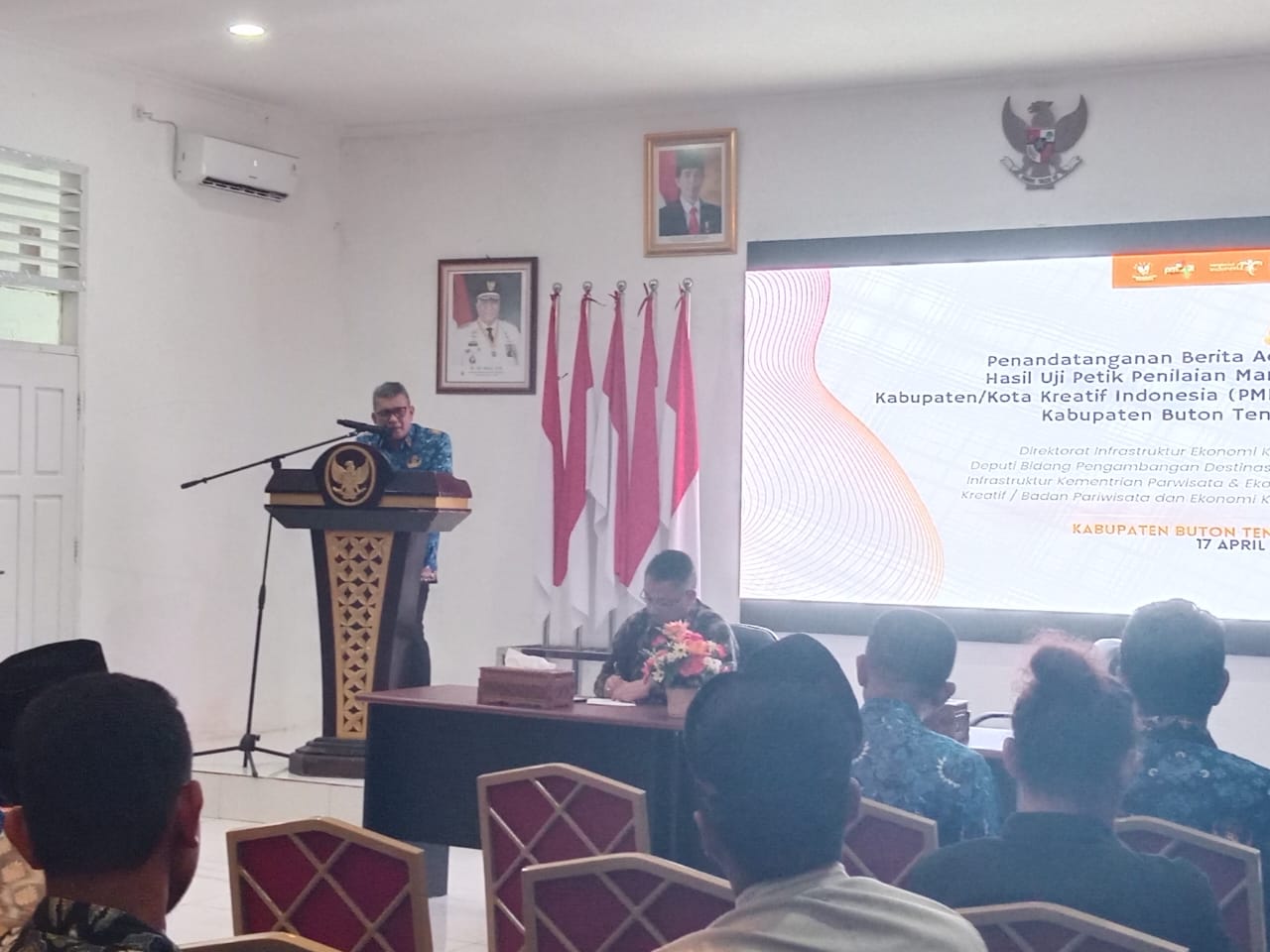 Hal itu ia ungkapkan saat menyampaikan sambutan dalam agenda penandatanganan Berita Acara Hasil Uji Petik Penilaian Mandiri Kabupaten/Kota Kreatif Indonesia (PMK3I) Kabupaten Buton Tengah dari Kementerian Pariwisata dan Ekonomi Kreatif Republik Indonesia (Kemenparekraf RI) yang dihadiri Direktur Infrastruktur Ekonomi Kreatif (IEK) Kemenparekraf RI Hariyanto, bertempat di aula kantor Bupati, Senin (17/4/2023).