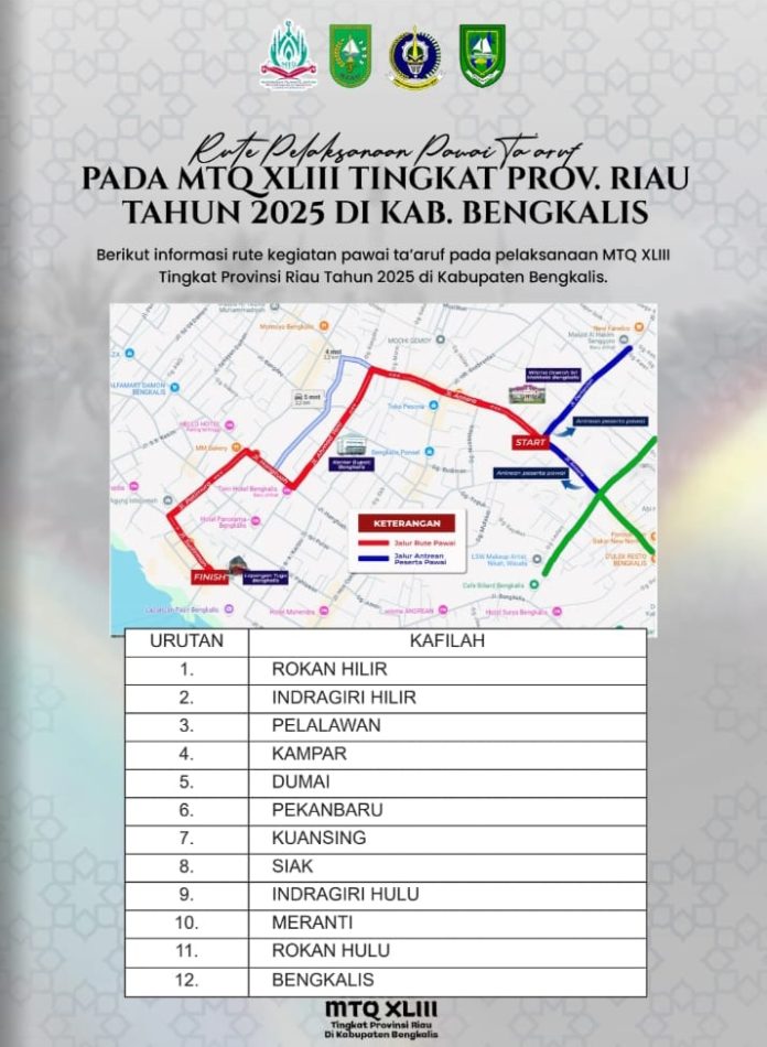 Pelaksanaan Pawai ta’aruf Musabaqoh Tilawatil Qur’an (MTQ) ke-43 tingkat Provinsi Riau tahun 2025, akan digelar pada Sabtu 28 Juni 2025 pagi, pukul 08.00 WIB. Start dari Wisma Bupati dan finish di Lapangan Tugu Bengkalis.