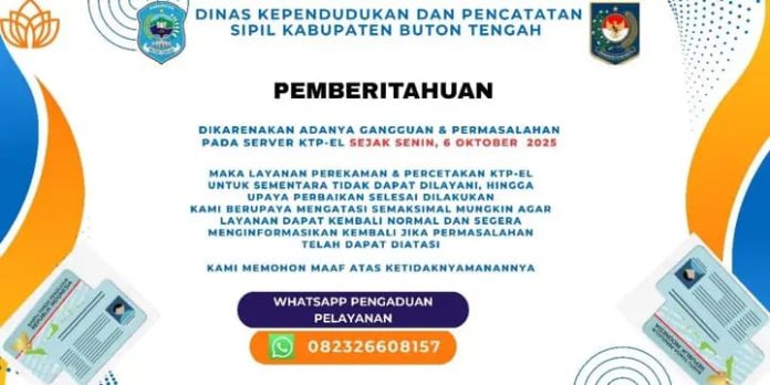 Buton Tengah, Mandalapos.co.id – Dinas Kependudukan dan Pencatatan Sipil (Dukcapil) Kabupaten Buton Tengah menyampaikan informasi penting kepada masyarakat bahwa layanan mengalami gangguan dan permasalahan pada server KTP-eL.