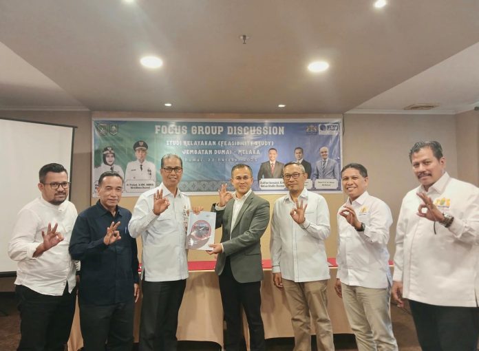 Bengkalis, mandalapos.co.id — Bupati Bengkalis melalui Asisten Perekonomian dan Pembangunan Sekretariat Daerah Kabupaten Bengkalis, Toharudin, menghadiri sekaligus ikut menandatangani Berita Acara Focus Group Discussion (FGD) dalam rangka penyusunan Feasibility Study (Studi Kelayakan) pembangunan Jembatan Dumai–Melaka, Rabu (22/10/2025), bertempat di Ballroom Hotel Grand Zuri Dumai.