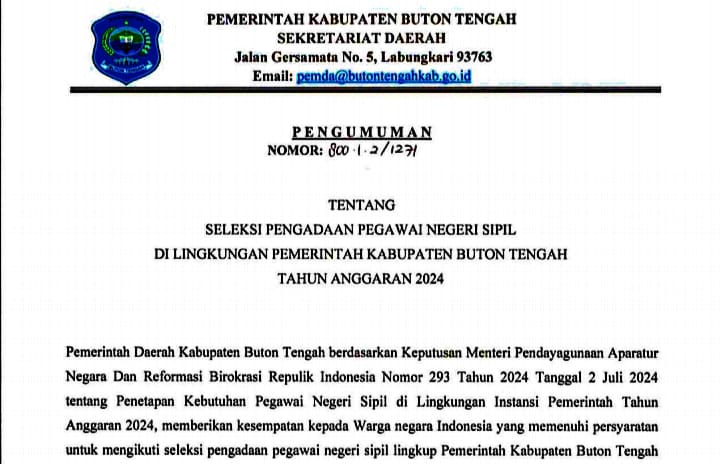 Mandalapos.co.id, Buton Tengah — Pemerintah Kabupaten (Pemkab) Buton Tengah, Provinsi Sulawesi Tenggara membuka seleksi pengadaan Pegawai Negeri Sipil atau PNS di lingkungan Pemerintah Kabupaten Buton Tengah tahun anggaran 2024.