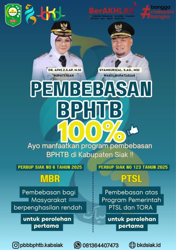 Kebijakan pembebasan BPHTB ini menjadi salah satu langkah strategis Pemerintah Kabupaten Siak dalam mendukung percepatan kepemilikan rumah layak huni, sekaligus memperkuat daya dorong ekonomi masyarakat di sektor properti daerah.*