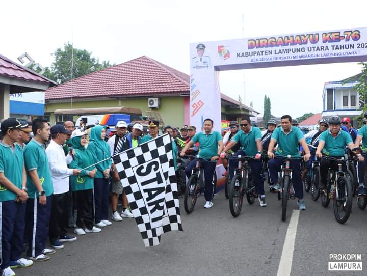 Mandalapos.co.id, Lampura — Bupati Lampura, Budi Utomo, bersama Wakil Bupati, Ardian Saputra, membuka acara puncak peringatan Hari Ulang Tahun (HUT) Ke-76 Kabupaten Lampung Utara yang diisi dengan berbagai kegiatan bertajuk “Pola Hidup Sehat” seperti, jalan sehat, sepeda santai, senam bersama, dan donor darah, Jum’at (17/6).