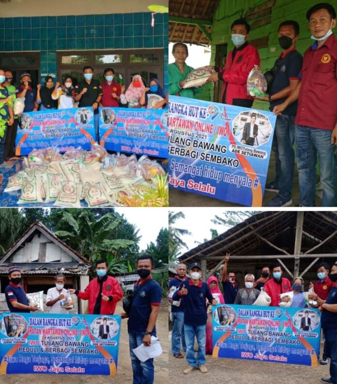 Mandalapos.co.id, Tulangbawang- Dalam Rangka HUT Ke-9 Tahun, Ikatan Wartawan Online (IWO) Tulang Bawang berbagi ratusan paket sembako serta masker, kepada masyarakat yang sedang menjalani Isolasi Mandiri (ISOMAN) dan Masyarakat tidak mampu di dua Kecamatan, yakni Kecamatan Menggala dan Kecamatan Menggala Timur Tulang Bawang Lampung.